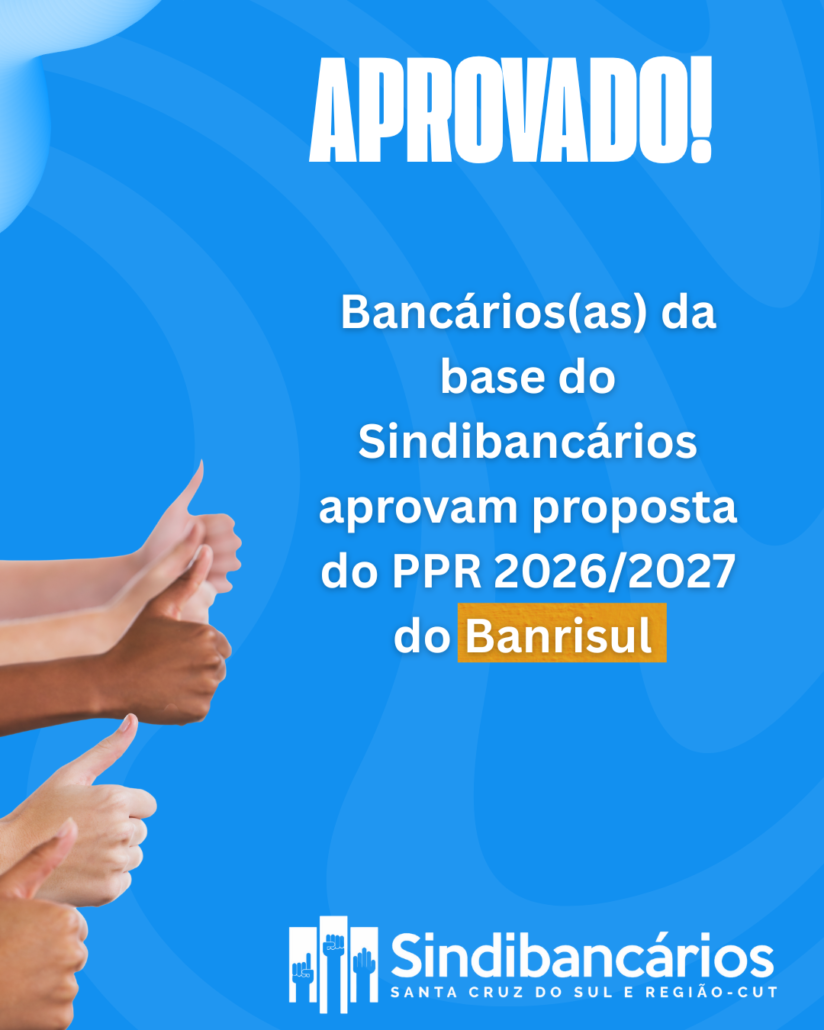 Os empregados e empregadas do Banrisul da base do Sindicato dos Bancários de Santa Cruz do Sul e Região aprovaram, com 93,15% de aprovação, a proposta do Programa de Participação nos Resultados (PPR) 2026/2027 apresentada pelo banco.