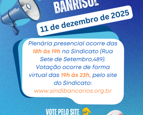 O Sindibancários de Santa Cruz do Sul e Região convoca as bancárias e os bancários do Banrisul da sua base a participarem dia 11 de dezembro, da plenária presencial, das 18h às 19h, na sede do Sindicato, rua Sete de Setembro, 489, centro…