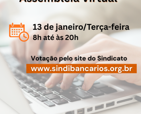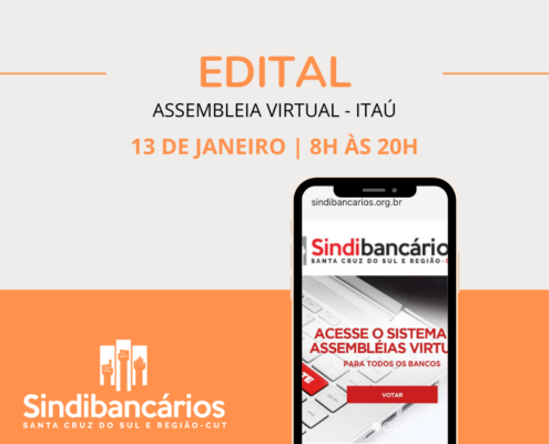 O Sindicato dos Bancários convoca os(as) empregados(as) do Banco Itaú Unibanco S/A e empresas do grupo, sócios e não sócios, para participarem da Assembleia Geral Extraordinária, que será realizada de forma virtual, no dia 13 de janeiro…