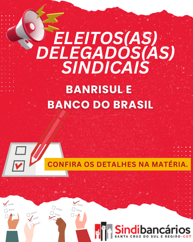 O Sindicato dos Bancários de Santa Cruz do Sul e Região divulga o resultado das eleições para delegados e delegadas sindicais realizadas durante o dia de ontem(10) e hoje(11), de forma virtual, pelo site do Sindicato. A votação definiu a representação sindical nas unidades do Banrisul e do Banco do Brasil para o próximo período de mandato.