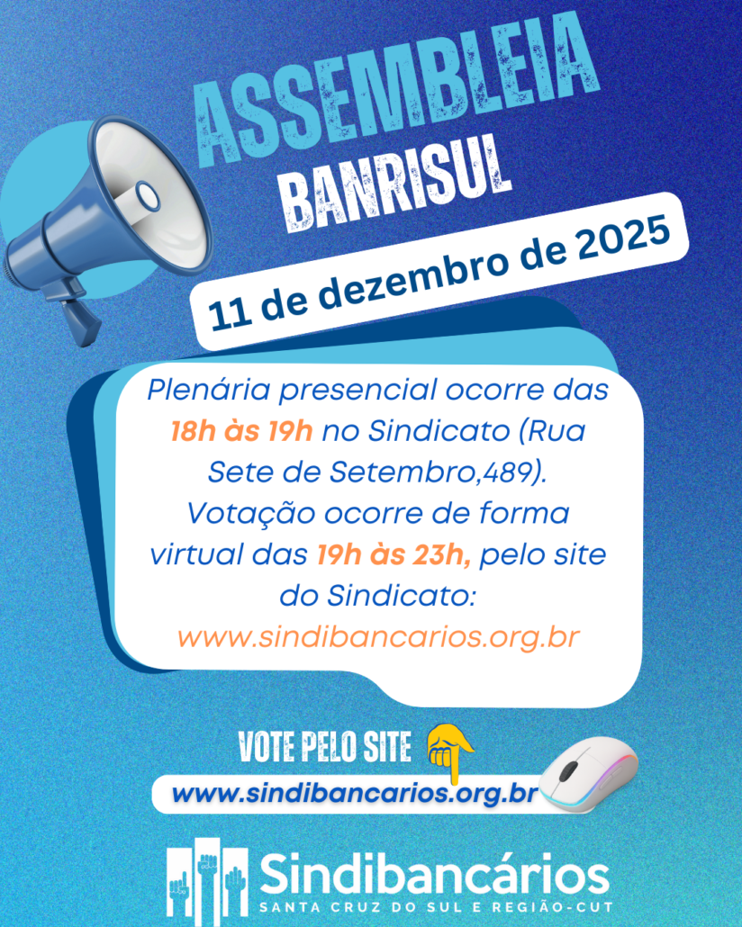 O Sindibancários de Santa Cruz do Sul e Região convoca as bancárias e os bancários do Banrisul da sua base a participarem dia 11 de dezembro, da plenária presencial, das 18h às 19h, na sede do Sindicato, rua Sete de Setembro, 489, centro de Santa Cruz do Sul. A votação virtual, inicia às 19h com término às 23h, pelo site do Sindicato: (www.sindibancarios.org.br).
